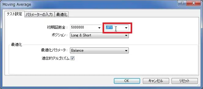 - 「エキスパート設定 → テスト設定」で 通貨単位をJPYに変更 可能