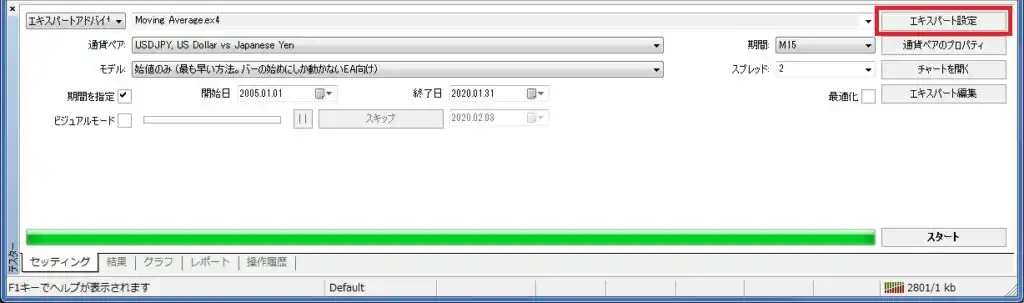 通常通りMT4でストラテジーテスターを開き、EAを選択します。