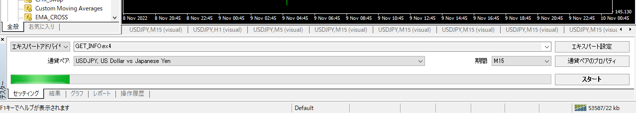 バックテスト時に緑色のバーが途中で消えて結果を表示してくれないという件ですが、原因はわかりません。ただ問題の解決としては、