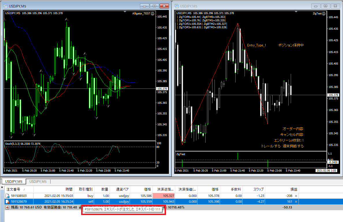下側のポジションのマジックナンバーを見てみると、マジックナンバーは「111」となっています。「111」は右側のEA②で設定したものなので、このポジションはEA②のものだという事がわかります。