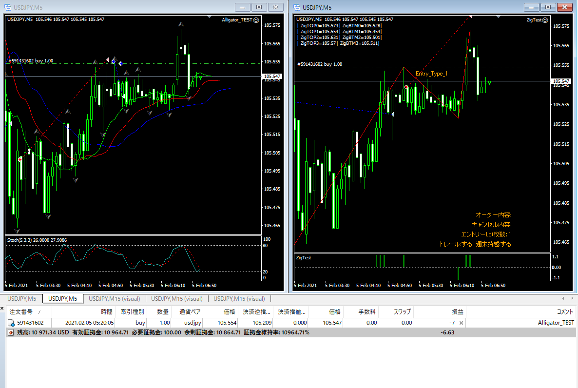 例えばこんな感じで、左のEA①と右のEA②別々のEAを1つのFX口座で稼働させており、左のEA①が新規エントリーしてポジションを持っている状態とします。