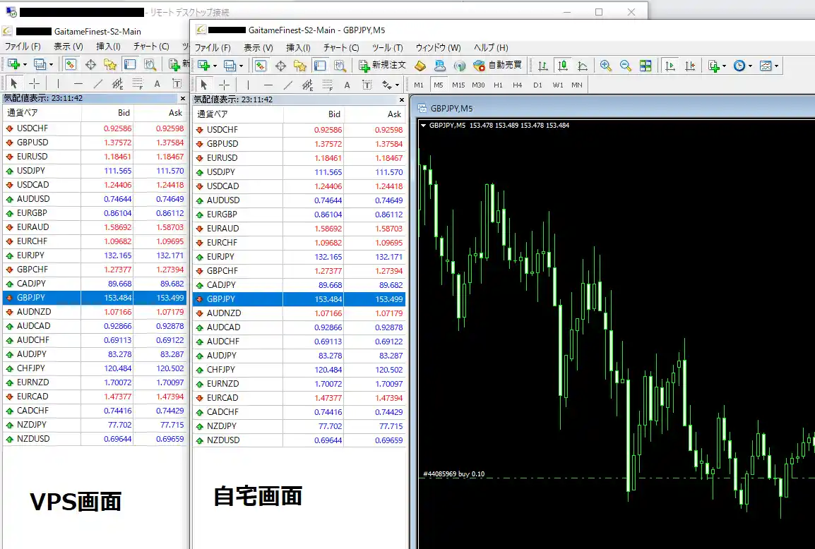 リモートデスクトップ経由だと、「レート表示が遅れて見えるのでは?」という懸念もありました。自宅PCとVPS画面を同時に表示して比較したところ…