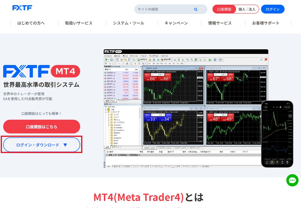 まずは、以下のリンクからFXTFのMT4ダウンロードページにアクセスします。