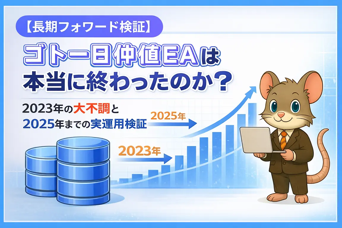 実際に私自身が運用しているゴトー日仲値EAについては、 以下の記事で実運用データ・注意点を含めて詳しく解説しています。