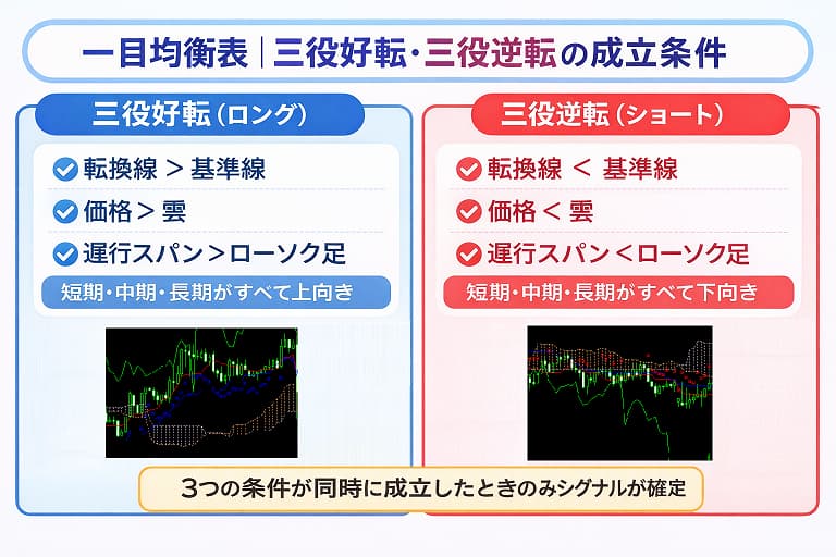 一目均衡表の三役好転・三役逆転は、トレンド判断の王道シグナルです。