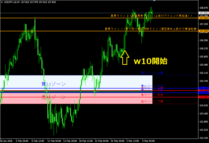 W10では重要ライン2(157.60)を明確に上抜け、週足実体でもブレイクが確認されました。 これにより、これまでのレンジ構造は上方向へ拡張され、 価格は上昇トレンドの継続局面へ移行しています。