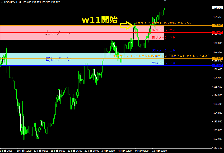 また、W11開始直後の値動きでは、 重要ライン2付近で一度上値が抑えられたあと、 買いゾーン上限付近で押し目が形成される動きが確認されました。