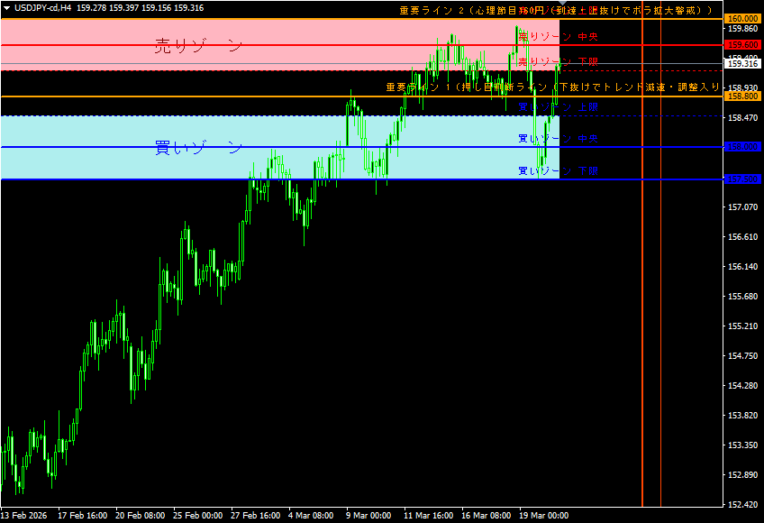 売りゾーンは心理節目160円到達前後での利確・失速が起きやすい価格帯として設定しています。