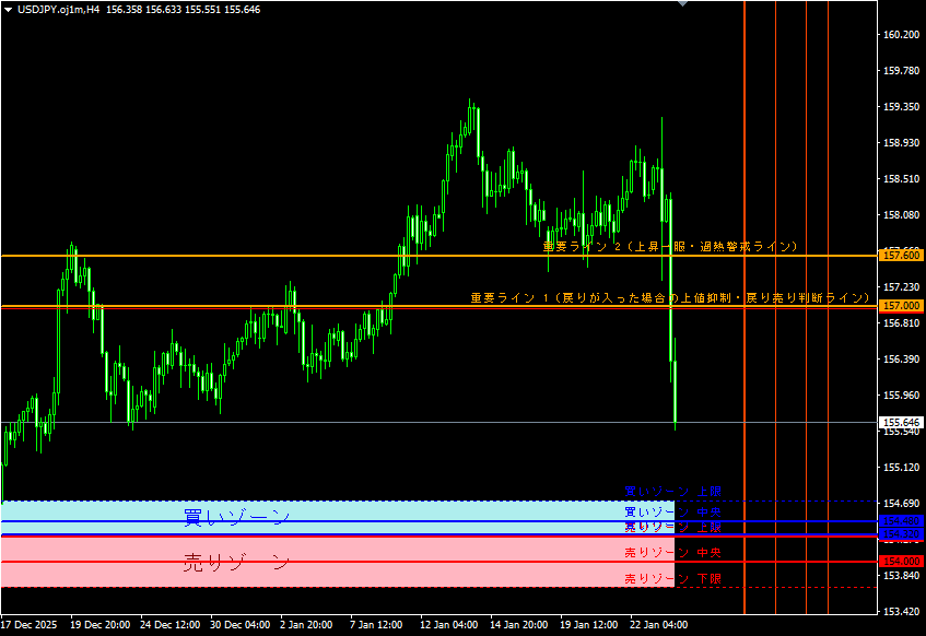 今週のUSDJPYを、売りゾーン・買いゾーン・重要ラインに分解して整理しました。